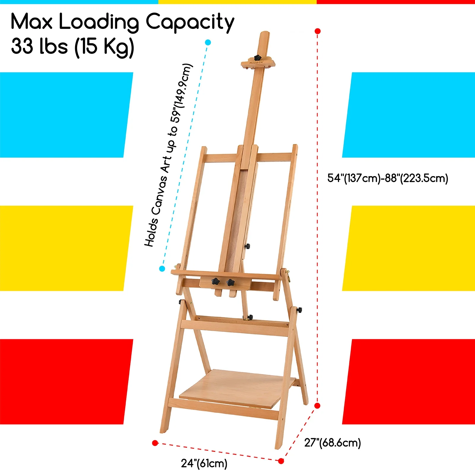 - Multi-Purpose Floor Easel: The spacious artist's platform shelf at the bottom of this large wood easel is perfect for holding various art supplies. It’s an ideal professional easel for both students and studio artists.